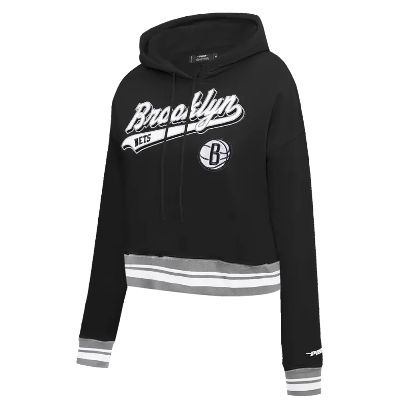NBA BROOKLYN NETS SCRIPT TAIL WOMEN’S RIB FLEECE CROPPED PULLOVER HOODIE (BLACK\/GRAY)