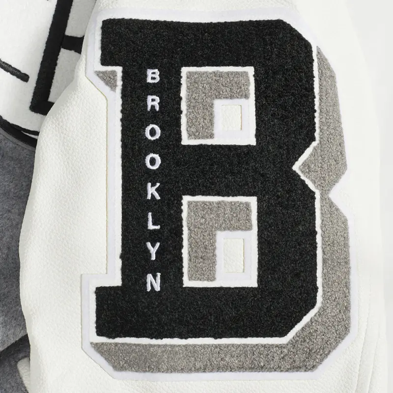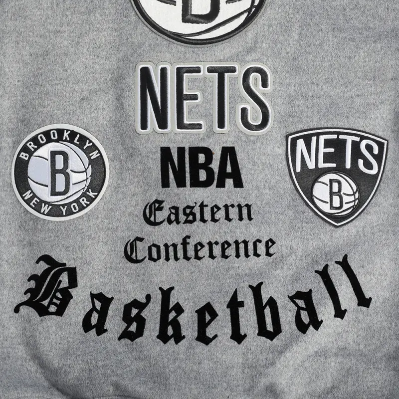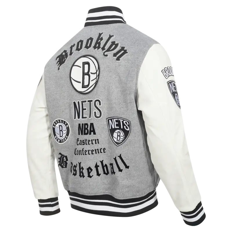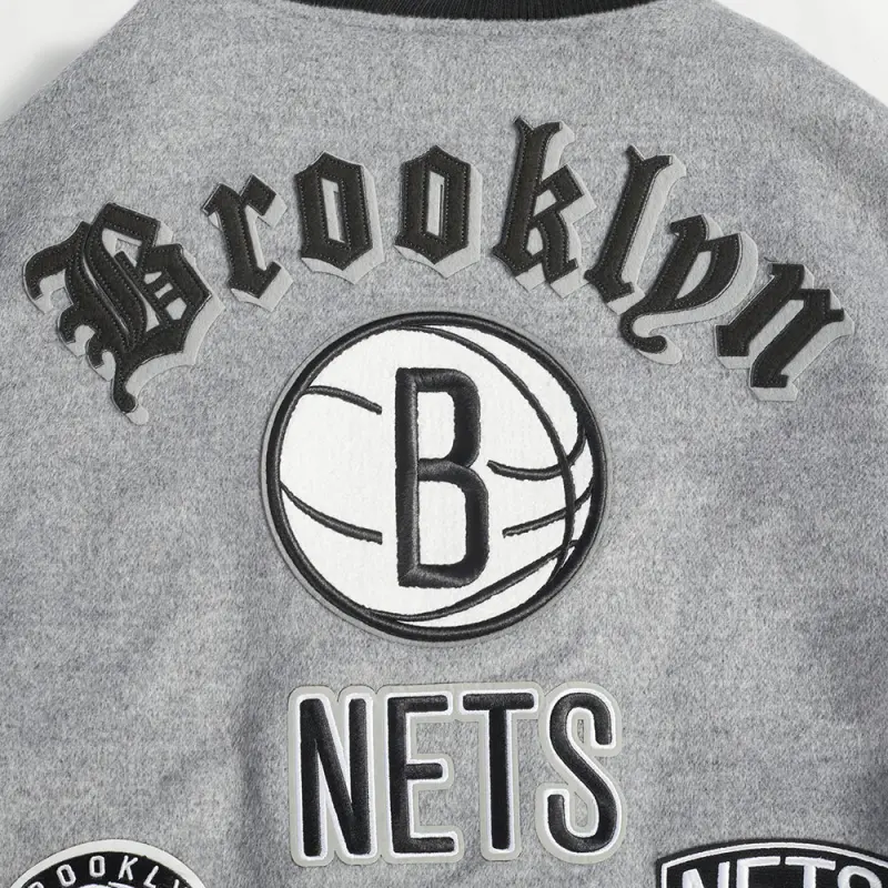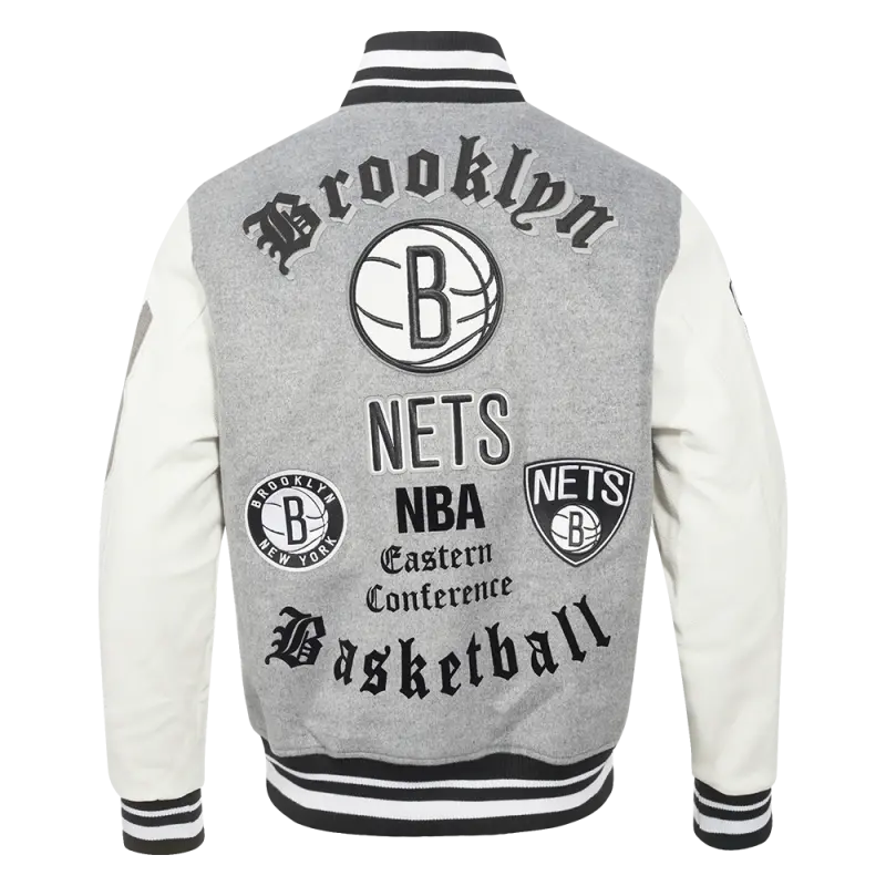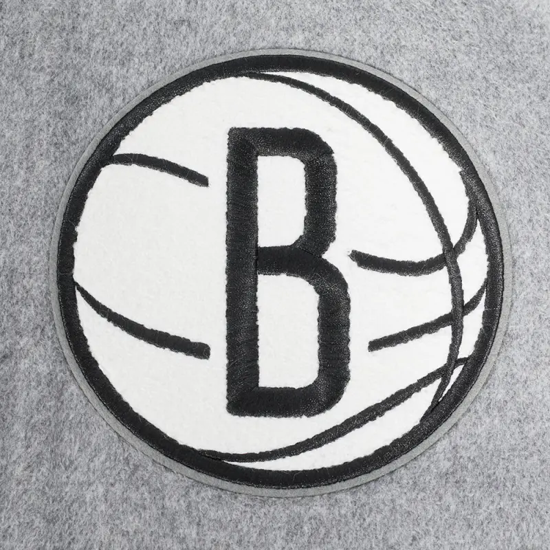 NBA BROOKLYN NETS OLD ENGLISH MEN’S RIB WOOL VARSITY JACKET (HEATHER GREY\/WHITE\/BLACK)