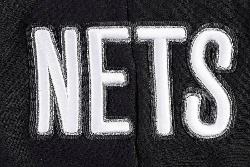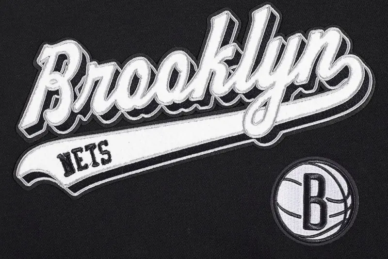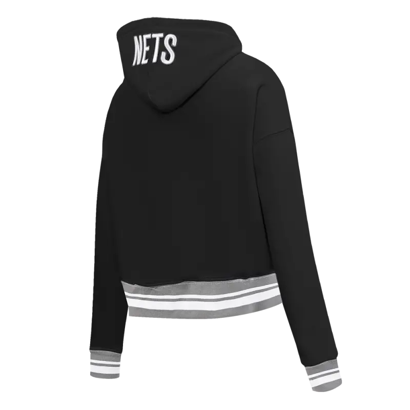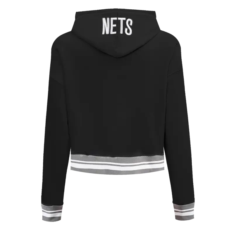 NBA BROOKLYN NETS SCRIPT TAIL WOMEN’S RIB FLEECE CROPPED PULLOVER HOODIE (BLACK\/GRAY)